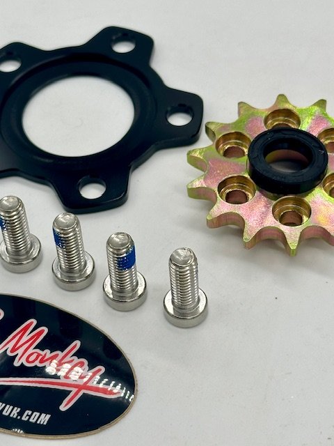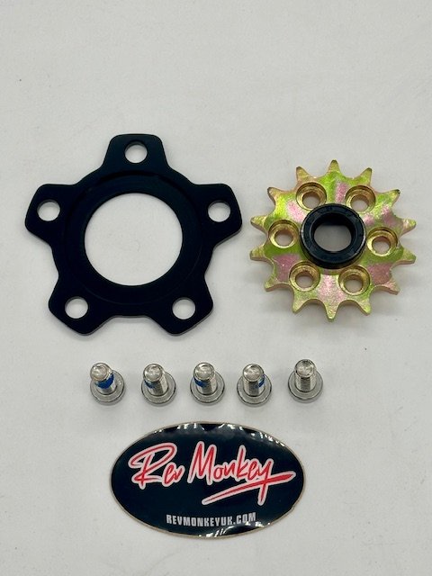 Kit comes with new front sprocket for the secondary drive, new spacer plate for the existing rear sprocket plus a set of new Hex drive sprocket bolts.