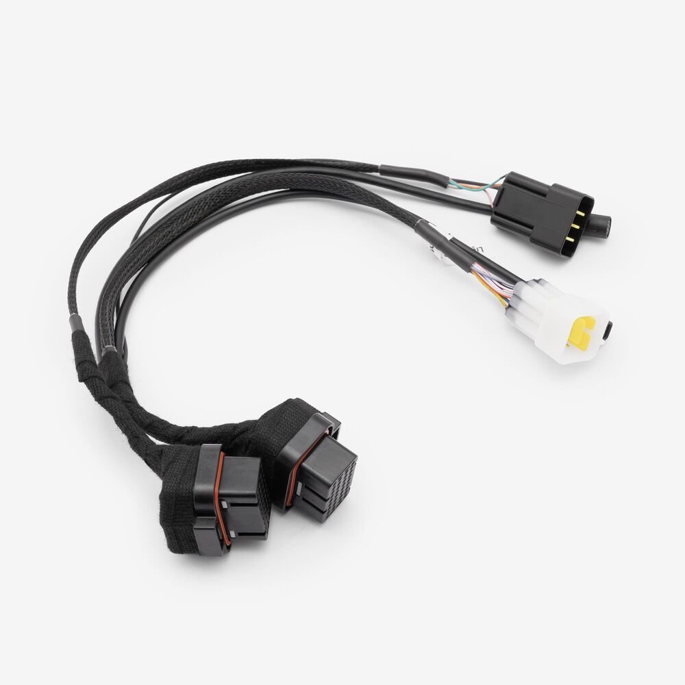 A motorcycle wiring loom, also known as a wiring harness, is a bundle of wires and connectors that transmits electrical power and signals throughout the motorcycle. It organizes and protects the electrical wiring, ensuring connections between components such as the ignition system, lighting, and various sensors. The loom is typically wrapped in protective sheathing to guard against wear and damage, and is designed to streamline installation and maintain a neat, efficient electrical system.