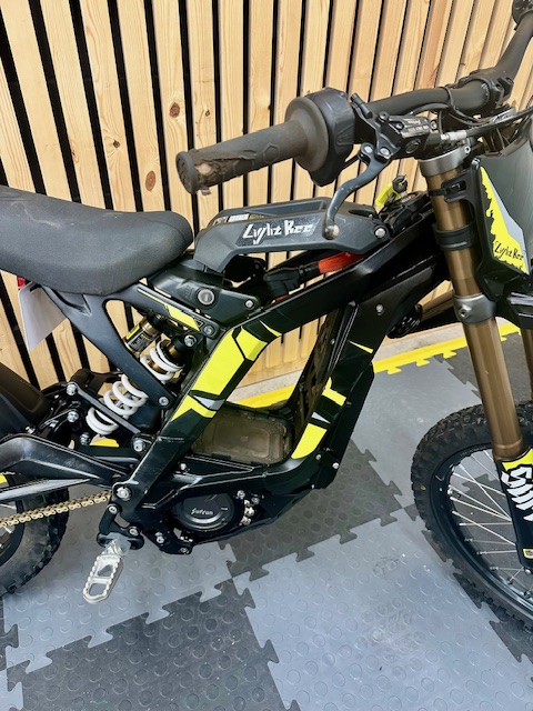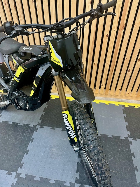 2025 Surron Light Bee LBX 8Kw first used 3 months ago as one of our demonstrators and still in very good condition. Finished in Carbon black with Yellow graphics. Low Kms. The 2025 LBX came with the uprated 8Kw motor, revised controller and new battery for better performance. They also had some frame revisions along with new wider rear tyre, bronze forks and uprated rear shock.